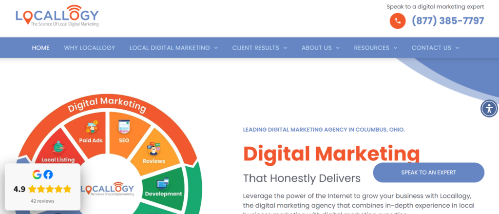 Locallogy is a Columbus-based digital marketing agency with a sharp focus on local business growth. Their positioning reflects a genuine understanding of what small and independent businesses in the Columbus metro area actually need: not enterprise-level complexity, but functional, well-built sites that generate local leads and convert neighbourhood traffic.
