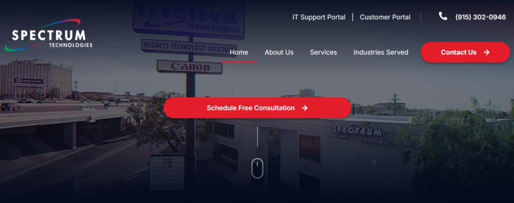 Spectrum Technologies has been serving El Paso since 1903, initially as an office systems company and now as a provider of integrated IT and digital marketing solutions. Their digital marketing services, including web design, SEO, and content management, sit alongside managed IT services, print solutions, VoIP, and network infrastructure.