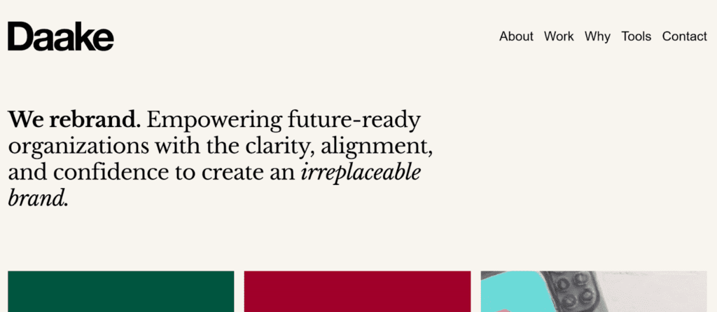 The agency works with businesses that need to redefine who they are, whether due to growth, market shifts, mergers, or outdated positioning. Daake’s process focuses heavily on strategy before design, helping clients clarify their positioning, competitive differentiation, and messaging architecture. Their work often includes naming, visual identity systems, messaging frameworks, and comprehensive brand guidelines that set the foundation for future marketing.