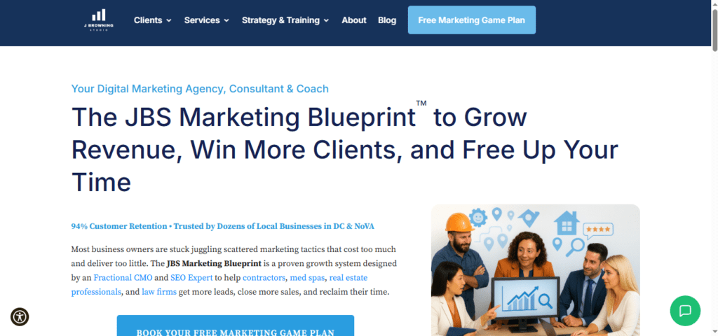 J Browning Studio approaches digital marketing through fractional CMO services combined with execution capabilities—positioning as the marketing department for small to mid-size companies throughout the DC and Northern Virginia region. The agency works with businesses in legal, real estate, publishing, and financial services sectors.