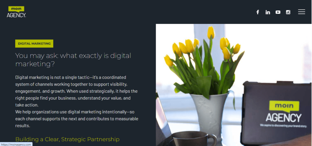 Their approach to SEO involves implementing strategies aligned with search engine algorithms to improve rankings and increase organic traffic. Moin Agency handles both new website builds expressing brand identity and audits of underperforming sites to improve architecture, design, and responsiveness.